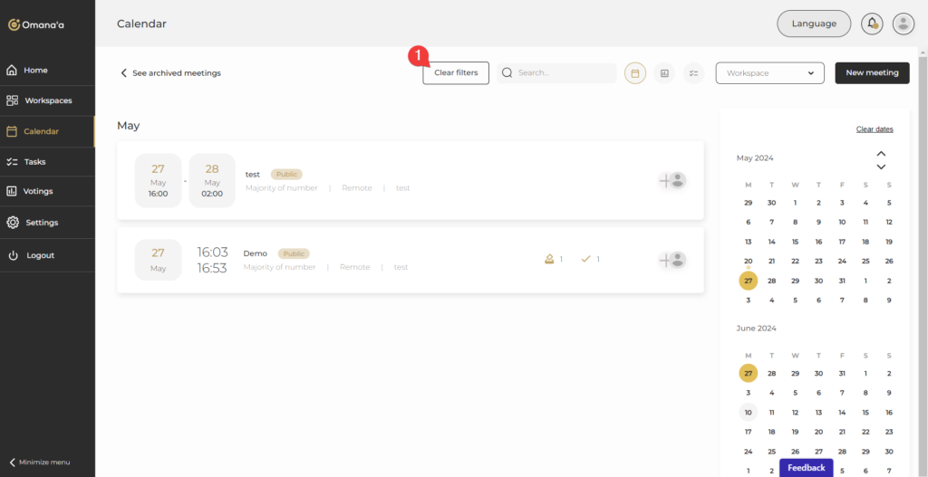 - في أعلى الصفحة، يمكنك مسح جميع عوامل التصفية المطبقة من خلال النقر على “مسح عوامل التصفية“، وتعيين القيمة الافتراضية على تاريخ اليوم وجميع الأحداث القادمة