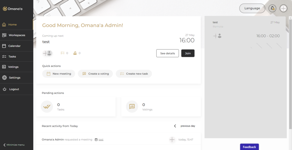 تم تصميم الاجتماعات في أمناء لتبسيط عملية جدولة الاجتماعات وتنظيمها وإجرائها، سواء كانت شخصية أو افتراضية. من وضع جدول الأعمال إلى تسجيل المحضر واصدار الملخص.
