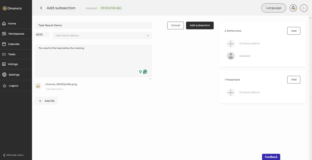 - المهمة: جلسة مهمة خلال الاجتماع، يمكنك اضافة: دليل المهام