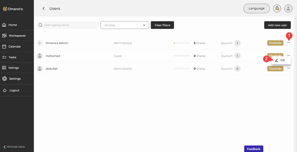 يمكن للمستخدمين الإداريين إضافة أو تحديث المعلومات الشخصية للمستخدم وتفاصيل الاتصال وصورة الملف الشخصي ودور وحالة المستخدم من خلال علامة التبويب “الإعدادات” ثم “قائمة المستخدمين“.