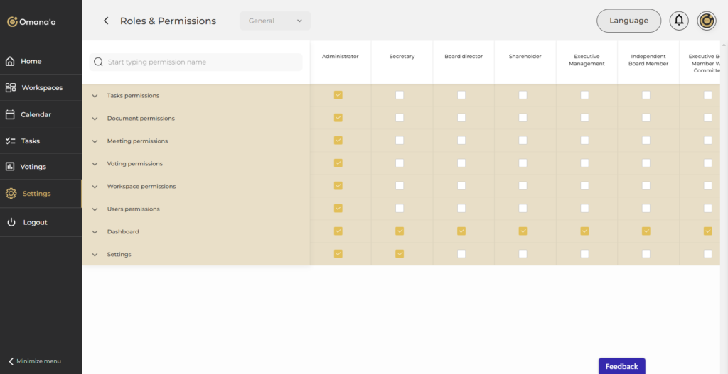 - هناك ثلاثة أدوار مختلفة وهي (عام، اجتماع، تصويت) لمزيد من التفاصيل راجع أنواع الأدوار والأذونات، للوصول إلى نوع دور معين في أعلى الصفحة، يوجد زر “عام” للتبديل بين صفحات الأذونات
