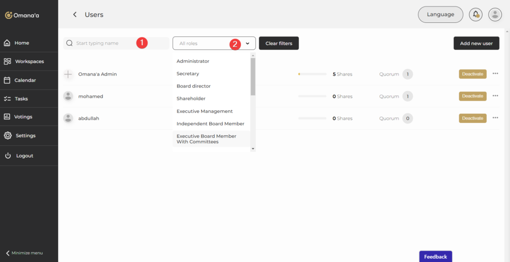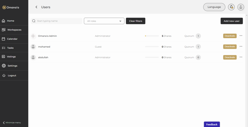 يمكن للمستخدمين الإداريين إضافة أو تحديث المعلومات الشخصية للمستخدم وتفاصيل الاتصال وصورة الملف الشخصي والدور وحالة المستخدم من خلال علامة التبويب “الإعدادات” ثم “قائمة المستخدمين“.