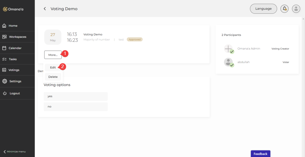 Voting in Omana’a is designed to facilitate decision-making, gather feedback, and engage participants in various voting activities. By clicking on the “Votings” tab in the menu