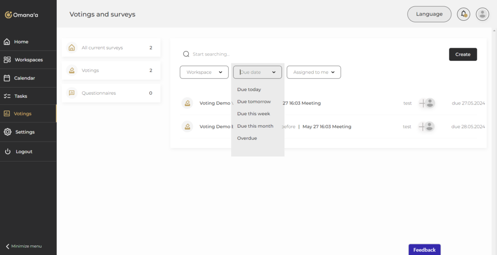 - You can filter the items depending on the voting due date, by clicking on the drop-down button “Due date” at the top of the page and selecting from the options