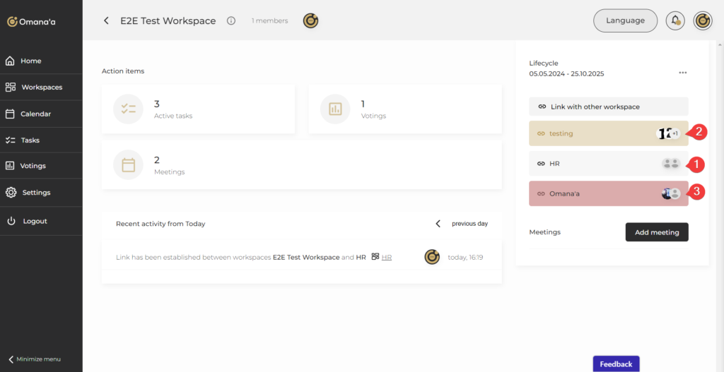 Workspaces in Omana’a are virtual collaboration spaces where users can share documents, discuss ideas, and collaborate on specific projects by clicking on the “Workspaces” tab in the menu: