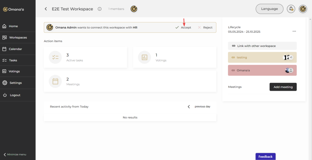 - If the workspace has a request from another workspace, will show a bar on the top page, click on “Accept” to activate the linking.